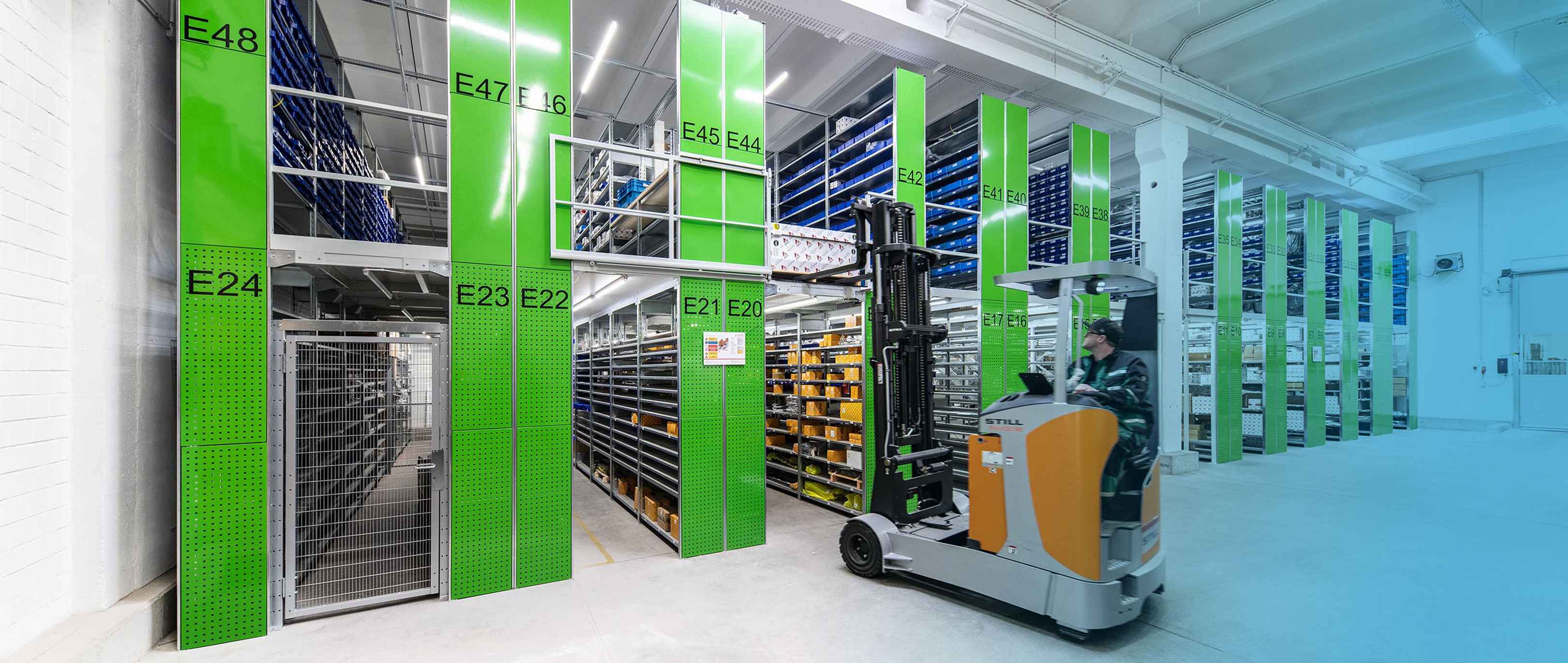 - Hohe Lagerkapazität bei geringem Platzbedarf dank möglicher Regalhöhen bis 8,5m